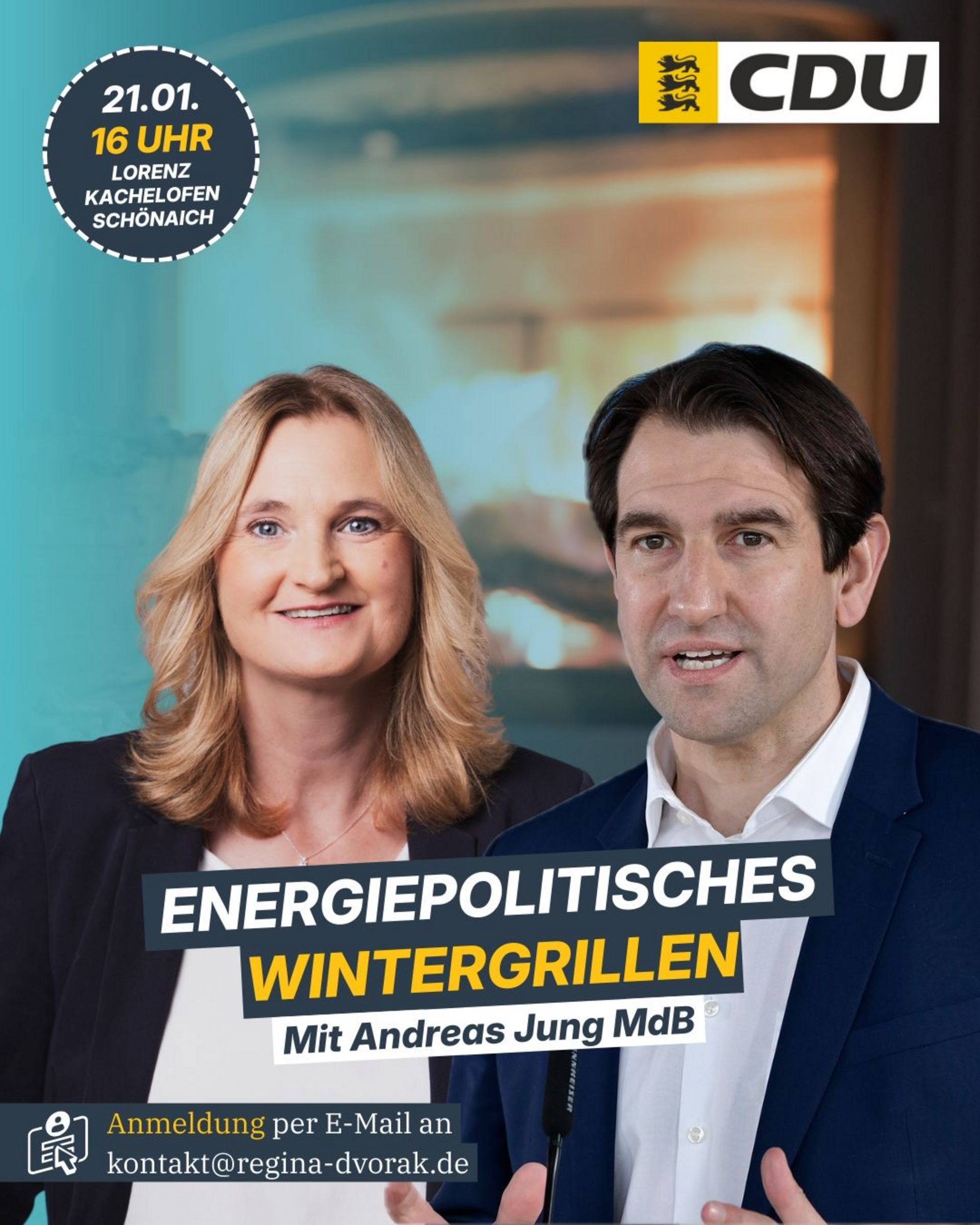 Die CDU-Landtagskandidatin Regina Dvořák-Vučetić lädt zu einem energiepolitischen Wintergrillen ein. Im Mittelpunkt der Veranstaltung stehen die Auswirkungen energiepolitischer Entscheidungen auf Bürger, Unternehmen und Handwerk – insbesondere im Bereich des Heizungsbau, der Sanitär-, Klima- und Ofentechnik sowie im Bau- und Ausbaugewerbe.